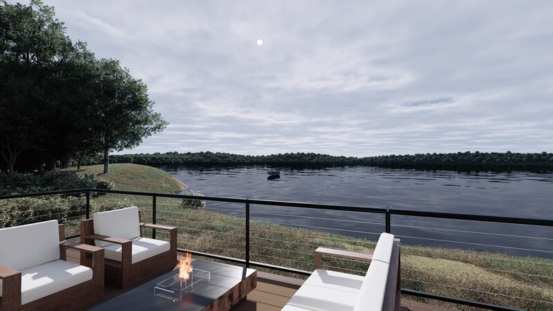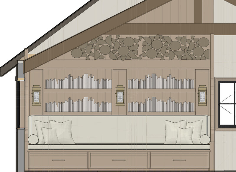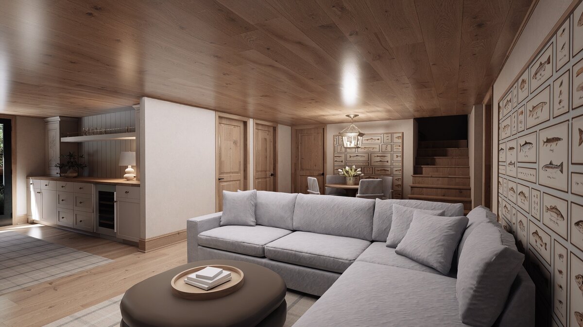 On the lake level, the “lake hall” replaces a traditional mudroom. This hardworking, beautiful space ensures wet towels, lake gear, and everyday items are neatly stowed. A built-in beverage bar keeps refreshments at the ready, while a cozy lounge with a sectional invites the family to gather for movies after long days on the water. A guest bedroom and an office/fitness room complete this level and all finished with the same wood and plaster details found throughout the home.